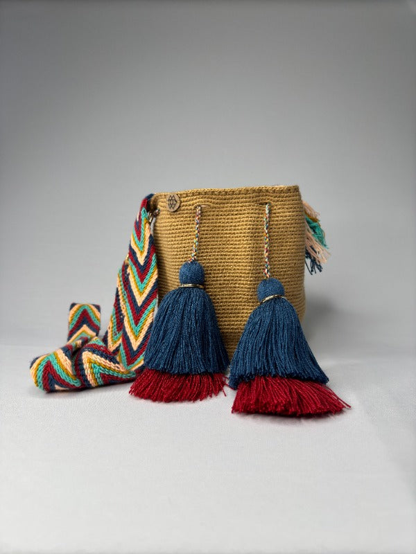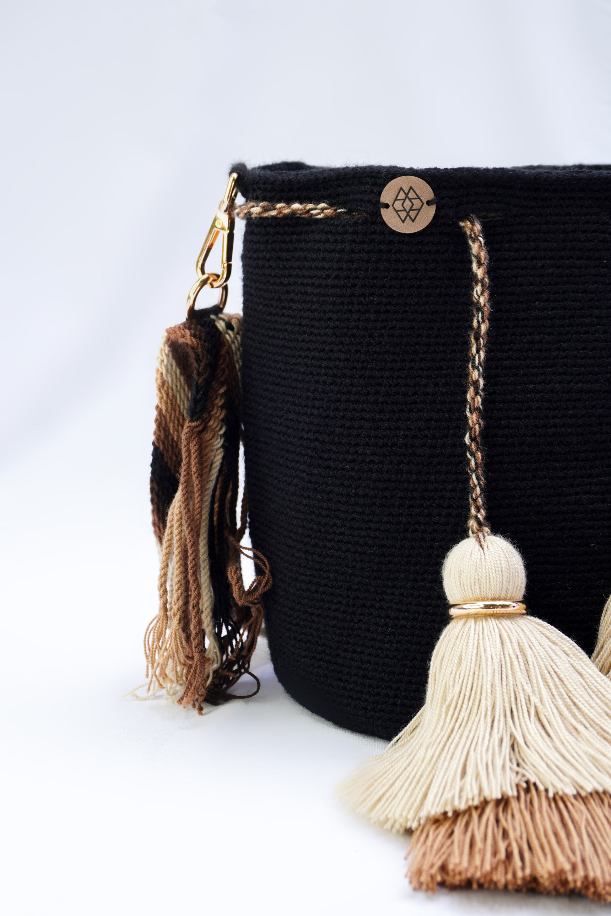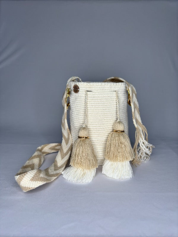 Mochila tejida a mano por indígenas wayuu, adornada con terminaciones en campanas y aros dorados que realzan su belleza, tiene una cargadera removible tejida para ser usada como mochila larga o corta y adicional una cadena de alta calidad que permite su uso como un bolso de lujo. Es un producto versátil que permite varios usos, sin perder su elegancia y esencia artesanal wayuu.