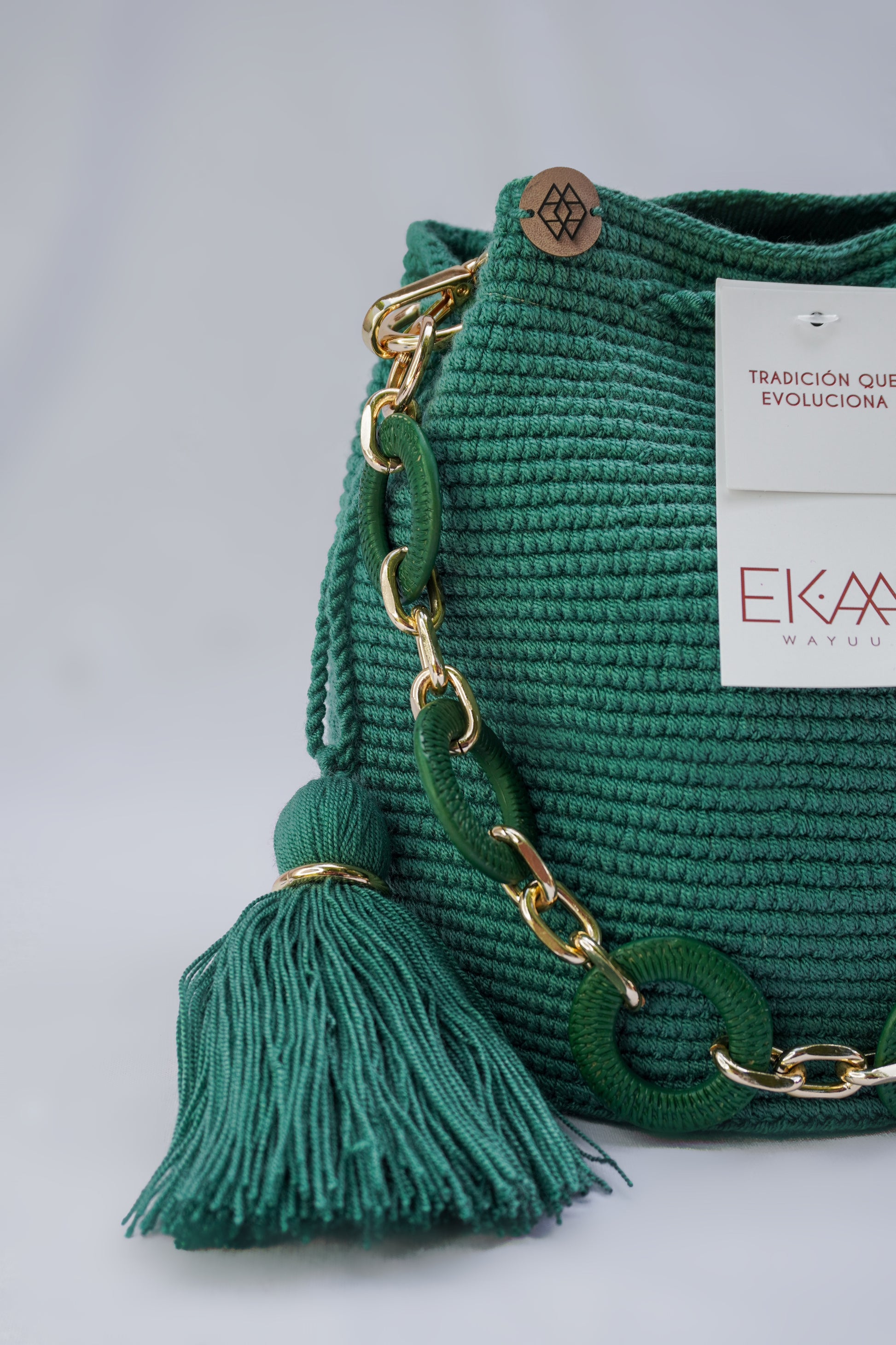 Mochila tejida a mano por indígenas wayuu, elaborada en un solo tono, adornada con terminaciones en campanas y aros dorados o plateados, que realzan su belleza, tiene una cargadera removible tejida para ser usada como mochila y adicional una manija tipo cadena de alta calidad que permite su uso como un bolso de lujo de mano. Es un producto versátil que permite varios usos, sin perder su elegancia y esencia artesanal wayuu.