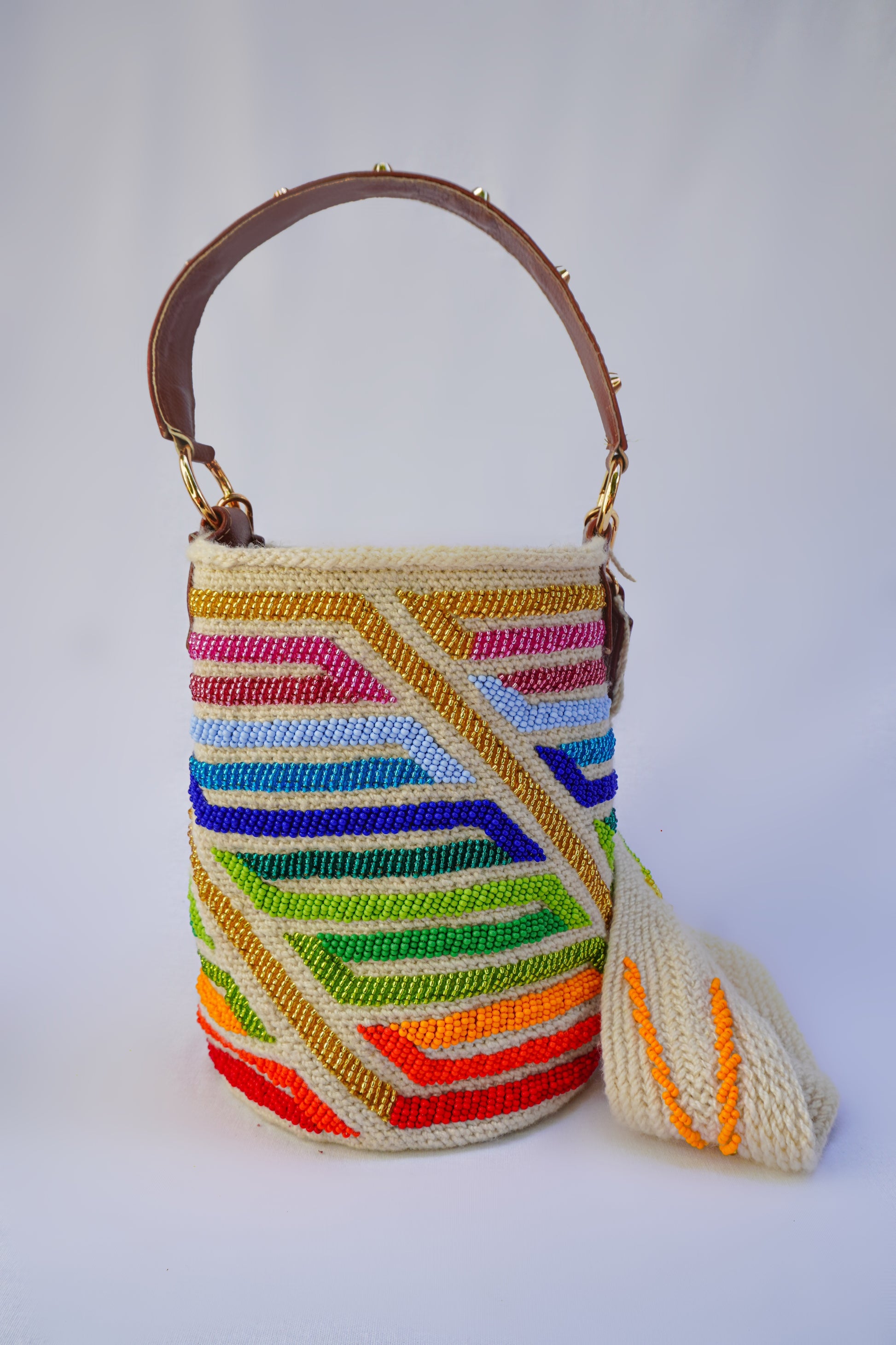 Hermosa mochila arhuaca elaborada 100 % a mano por artesanos indígenas Arhuacos de la Sierra Nevada de Santa Marta. Tejida en lana de oveja natural, esta pieza destaca por su delicado trabajo en mostacilla, aplicada de manera individual, formando patrones geométricos coloridos que reflejan la riqueza cultural y simbólica de esta comunidad ancestral.