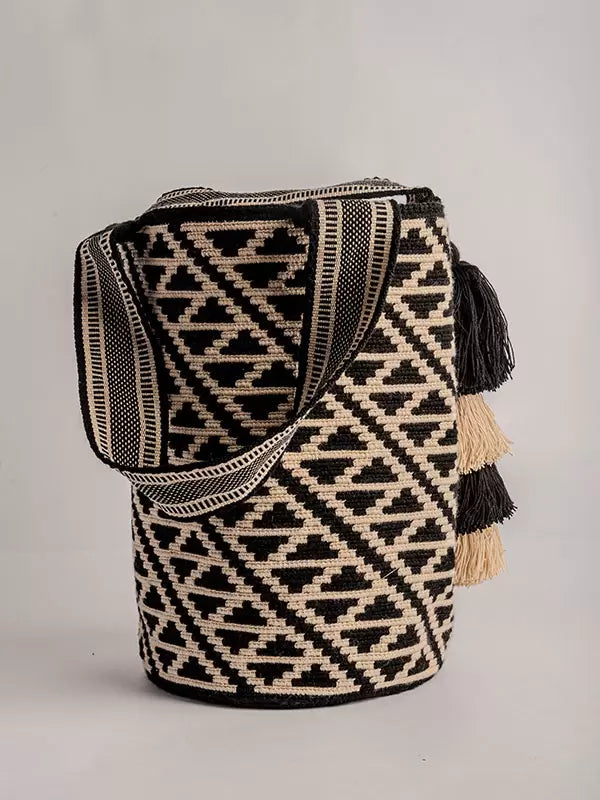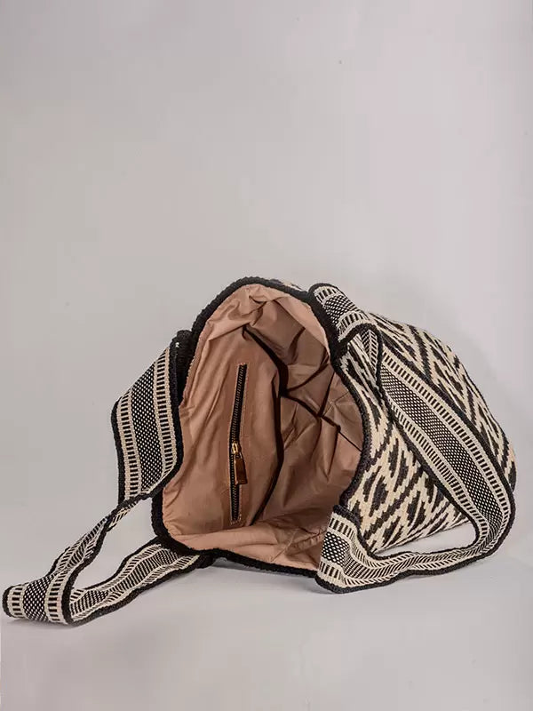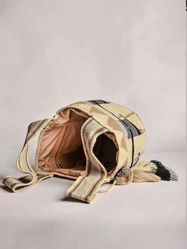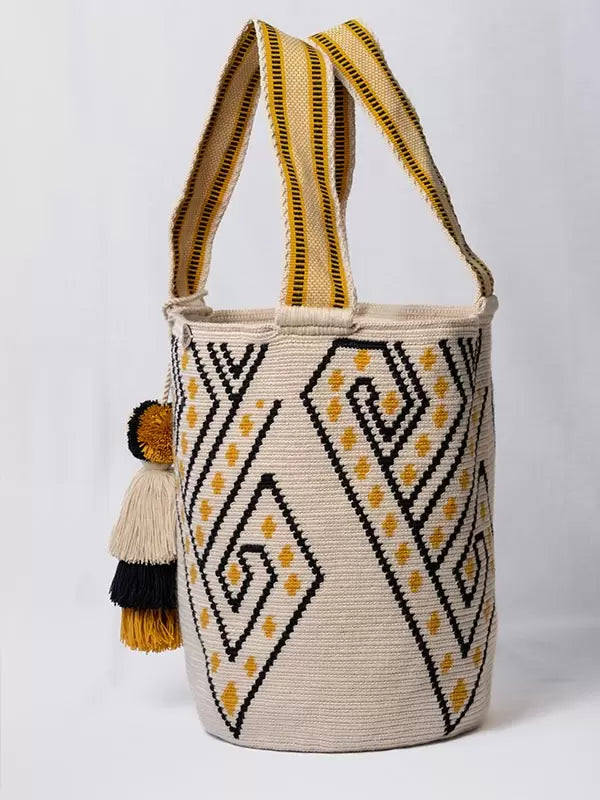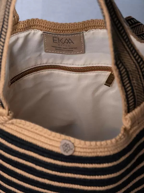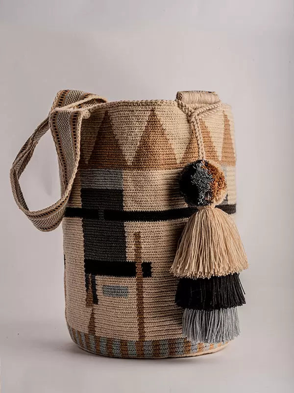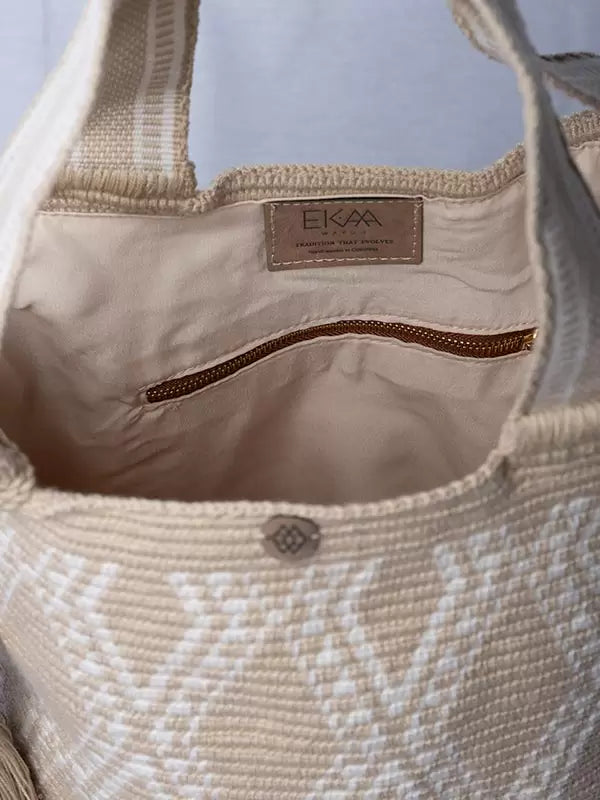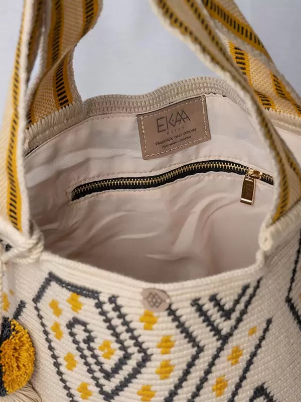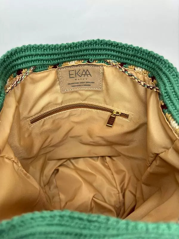 Su diseño amplio permite llevar gran variedad de útiles y accesorios, lo que hace de este bolso un elemento versátil para usar en cualquier ocasión, manteniendo siempre la tradición ancestral de la comunidad wayuu. El bolso cuenta con forro y bolsillo interno premium marca Ekaa